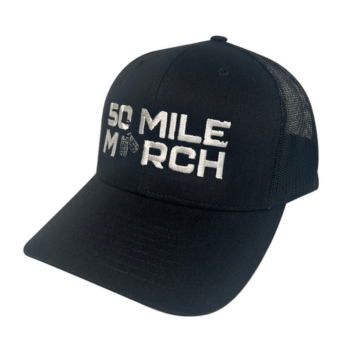All black, structured trucker hat with white embroidered logo, black mesh, snapback closure.