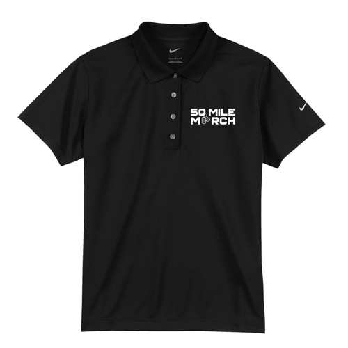 Black Nike Women's cut polo with white left chest embroidered 50 Mile March Logo