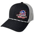 Navy heather front with white brim rope, Between the Rows rubber patch on the left panel, with silver snapback mesh.