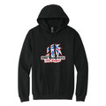Black hoodie with full chest print of "Between The Rows" Logo.