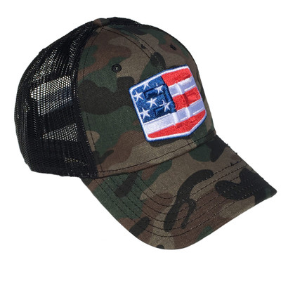 Grey Front with blue embroidered logo with stars and stripes back mesh