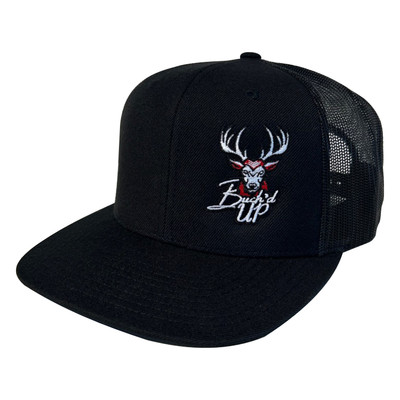 Heather Grey front panel with black and white Buch'd Up embroidery lettering with black stitched bill and black snapback mesh
