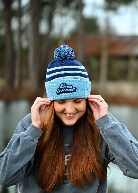 Navy, Light Blue, White Striped knit style hat with Retro Font Style Farm Focused Embroidered patch on edge