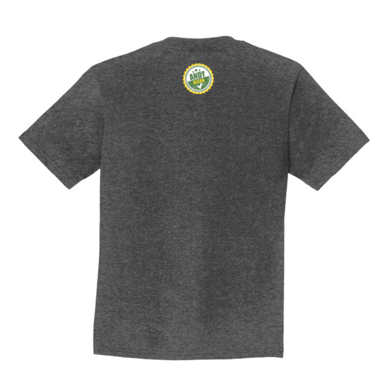 Full color print on dark heather grey tee with Andy Clean logo top center back