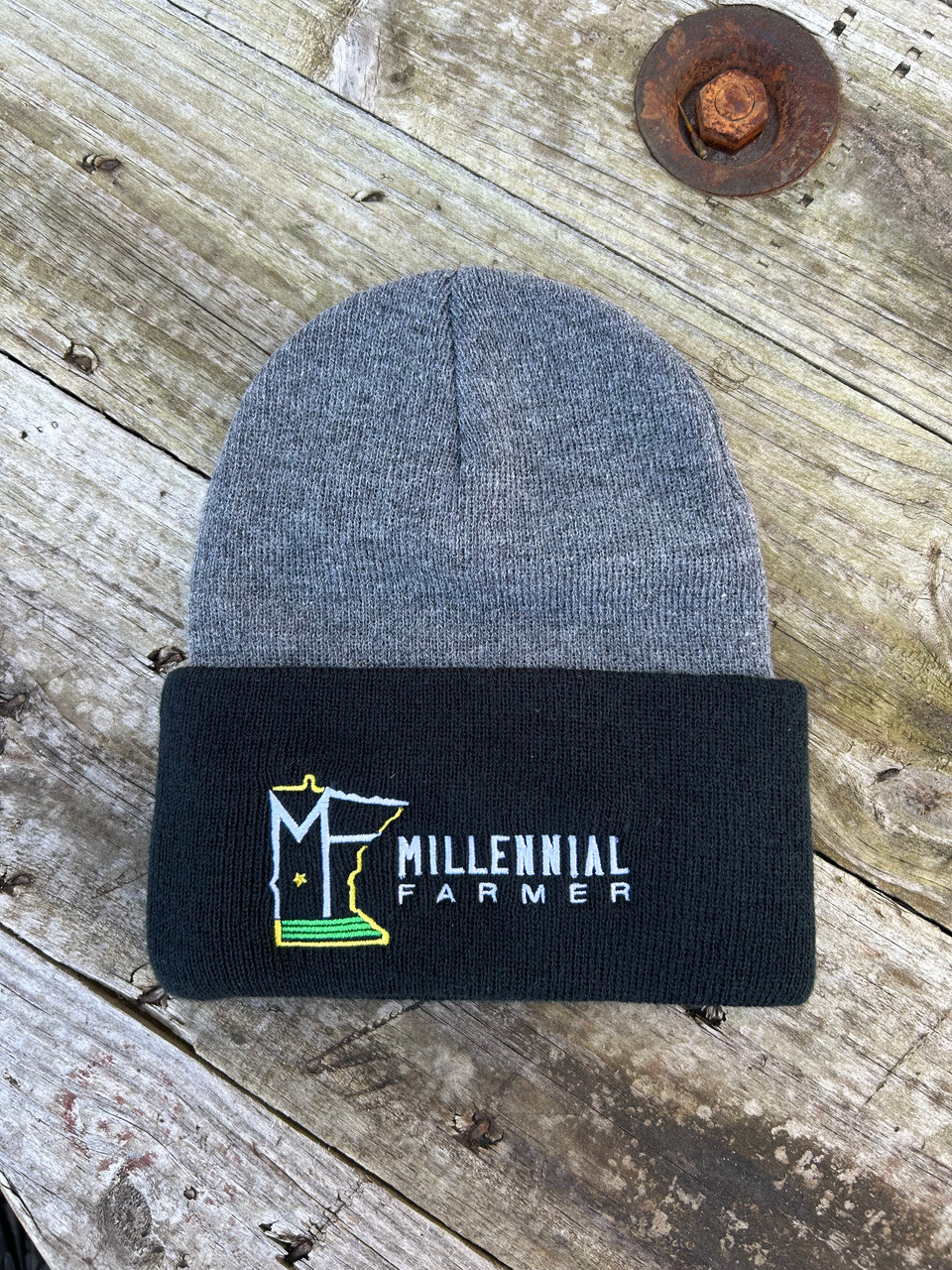 Grey and black knit hat with full color Millennial Farmer embroidered logo on cuff