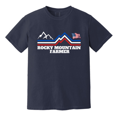 Comfort Colors Navy Tee with red, white and blue Rocky Mountain Farmer Logo